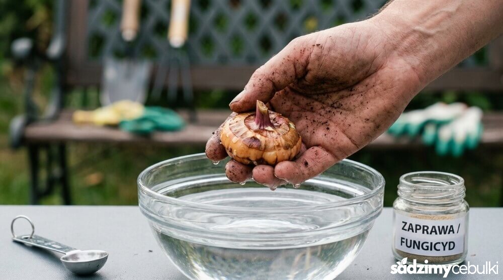 Jeśli decydujesz się na pełną ochronę, sięgnij po gotowe środki ochrony roślin dostępne w sklepach ogrodniczych. Najczęściej stosuje się fungicydy (środki grzybobójcze). Szukaj preparatów dedykowanych do zaprawiania cebul roślin ozdobnych (np. zawierających kaptan lub inne substancje aktywne dopuszczone do użytku amatorskiego). Często stosuje się uniwersalne zaprawy nasienne w formie proszku, z których sporządza się zawiesinę wodną.