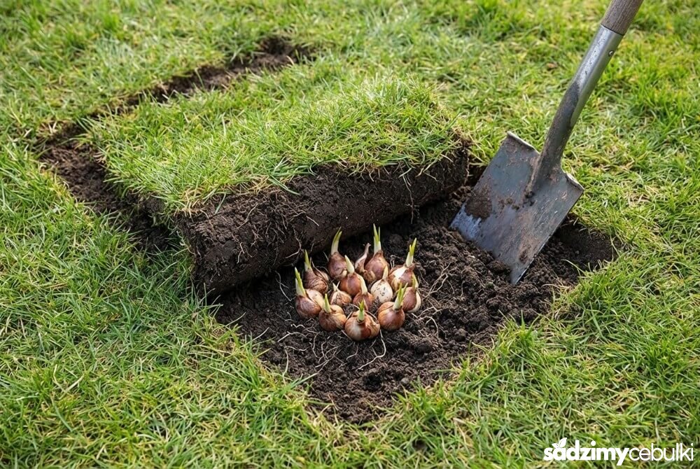 Następnie należy delikatnie odchylić płat darni, spulchnić odsłoniętą ziemię i umieścić w niej cebulki (najlepiej grupami). Po posadzeniu przykrywamy miejsce odchyloną trawą i mocno dociskamy. Dzięki temu wiosną trawnik będzie wyglądał nienagannie, a kwiaty swobodnie przebiją się przez trawę.